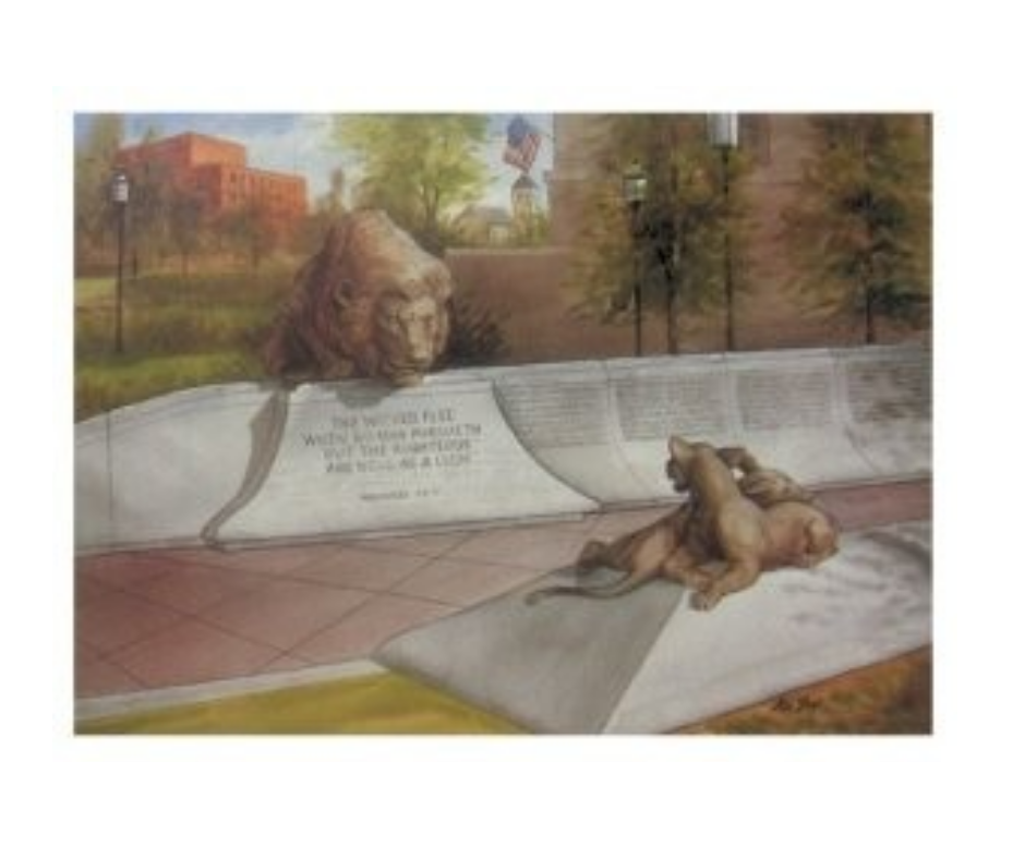 Ken Frye limited edition watercolor print depicting the National Law Enforcement Officers Memorial “pathways of remembrance” where the names of the fallen officers are engraved. Each pathway entrance is adorned with a powerful statuary grouping of an adult lion protecting its cubs. The bronze statues symbolize the protective role of law enforcement officers and convey the strength, courage and valor that are characteristic of those who serve and protect.