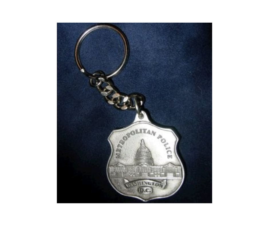 Pewter key chain with a miniature replica Metropolitan Police Department, Washington, D.C. badge. The badge is double sided and appears the same from either side.